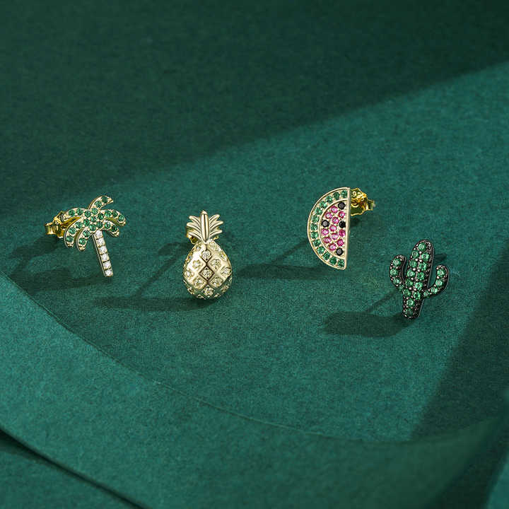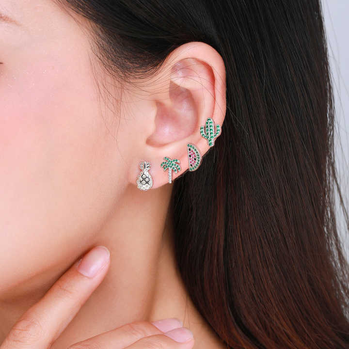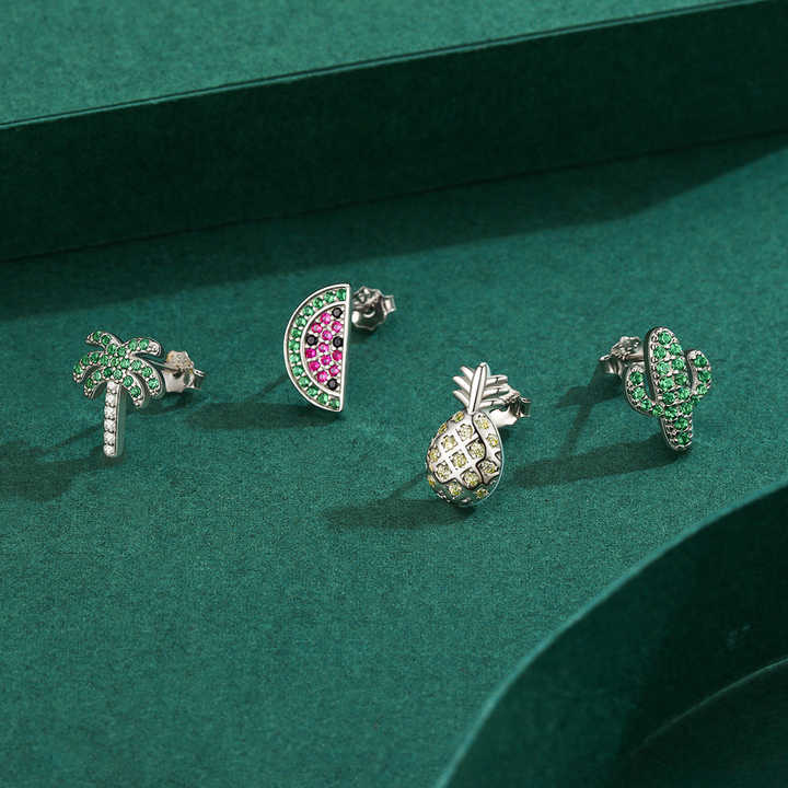 Crafted from 925 sterling silver, these lightweight stud earrings feature a charming fruit-inspired design with watermelon, cactus, and coconut tree motifs. Each piece is delicately set with sparkling zircon crystals using micro-insert technology for lasting durability. The rhodium and platinum plating ensures a tarnish-resistant finish while maintaining a bright silver tone. Measuring 1x1x1 cm and weighing only 0.001 kg, these hypoallergenic earrings offer comfortable all-day wear. Ideal for sensitive ears, they combine style with practicality for daily use or special occasions including weddings, anniversaries, office events, and parties. The secure stud backing provides reliable wear, while the CMA-certified materials guarantee quality. Presented in protective packaging, these versatile earrings serve as thoughtful gifts for loved ones or a stylish addition to personal jewelry collections. Designed for women seeking delicate accessories, they effortlessly transition from casual daytime wear to elegant evening ensembles.