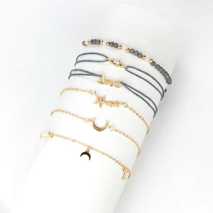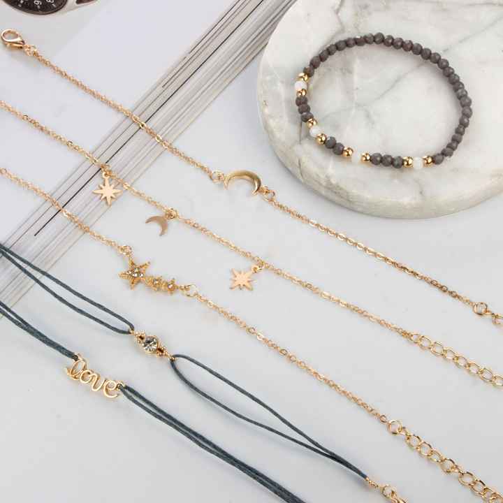 Elevate your bohemian style with this exquisite charm bracelet set featuring intricate moon and star motifs. Crafted from durable alloy, these bracelets showcase sparkling crystal beads arranged in a geometric pattern using secure channel-setting technology. The set includes multiple link chain designs with silver or gold plating, offering a versatile mix-and-match option for layered looks. Measuring 6 cm in adjustable length, these lightweight bracelets (0.020 kg) ensure comfortable all-day wear. Perfect for weddings, anniversaries, or festive occasions, this jewelry set comes ready-to-gift in compact 6x6x6 cm packaging. The trendy boho design combines celestial elements with handcrafted charm details, making it suitable for both casual outfits and special event attire. Care instructions: Wipe gently with a dry cloth to maintain plating longevity and avoid contact with chemicals.